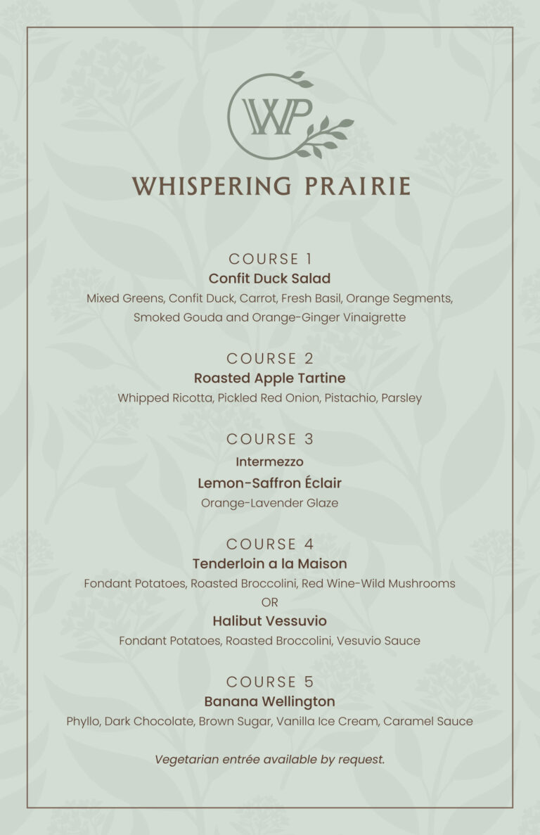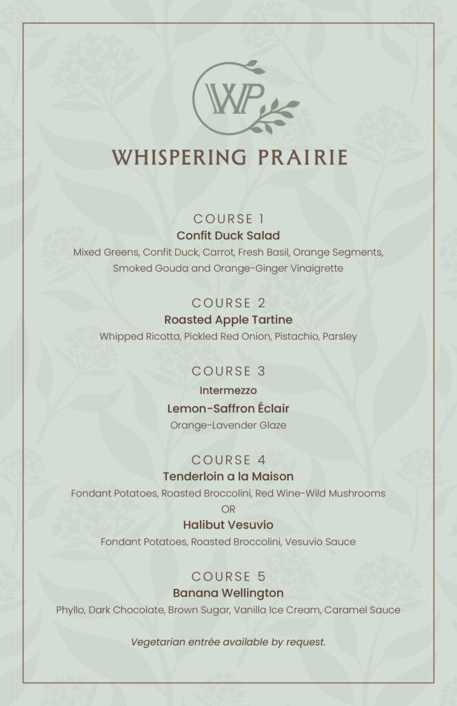 Below you can find examples of what our chefs create throughout the year—guided by what’s fresh and abundant. Each dish is rooted in ingredients sourced from Chef Harrison at Whispering Prairie. Our club dining experience celebrates seasonal flavors and Kansas fare, with no two menus ever quite the same—featuring guest favorites alongside new inspirations from the land.